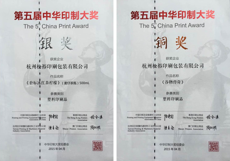 由中國印刷及設(shè)備器材工業(yè)協(xié)會主辦的第五屆中華印制大獎已完美落幕,中華印制大獎賽立足于中華地區(qū)的印刷行業(yè),由大陸、香港、臺灣、澳門四個地區(qū)的印刷協(xié)會共同舉辦,獎項涵蓋各類印刷產(chǎn)品、杰出企業(yè)家等,是行業(yè)內(nèi)唯一經(jīng)國家批準(zhǔn)的保留評比項目,華人印刷界最高印刷獎項。松裕公司報名了本次大獎賽并前往廣東參加了頒獎典禮,本次大賽形式新穎、大獎紛呈,最終評選出金獎20個,銀獎53個,銅獎85個以及優(yōu)秀獎91個。松裕作為凹印界的一顆新星,與協(xié)會保持密切溝通,及時抓住機(jī)會,經(jīng)個人申報、單位推薦、專家評審等程序,松裕公司報送的“套標(biāo)冰紅茶檸檬(麥仔茶瓶)”獲得塑料印刷品類銀獎,“谷物傳奇”獲得塑料印刷品類銅獎,共計兩個大獎。